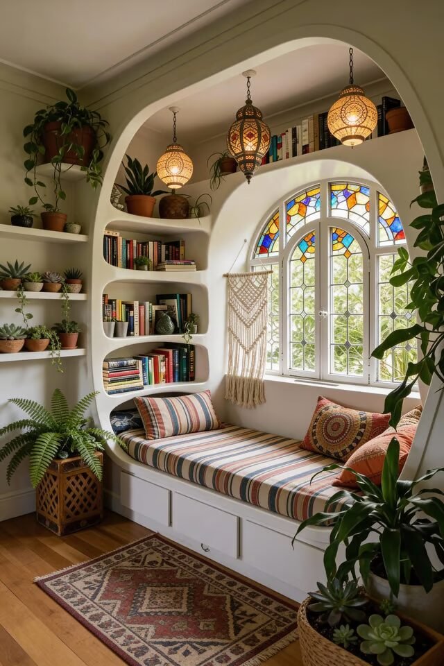 Arches are having a moment, and this nook shows why. The arched opening acts as a visual transition, signaling that you’re entering a slower, softer zone. Curves psychologically reduce tension, which makes them perfect for reading spaces.