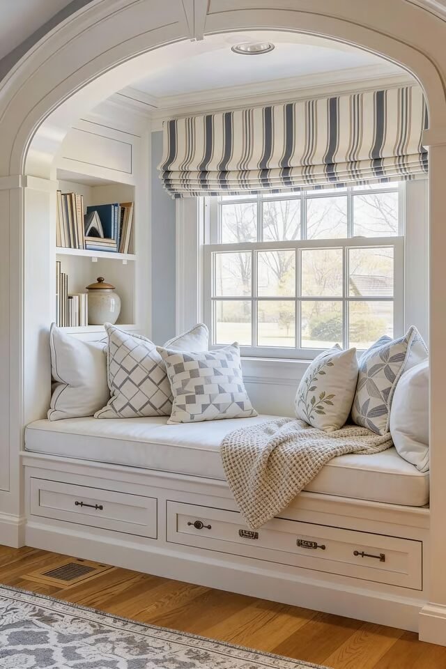 Roman shades are a smart choice because they soften the window without blocking light or overwhelming the nook. If we’re being honest, this nook works because it feels intentional, not accidental. It doesn’t scream “extra seating.” It whispers, “main character energy, but calm.”