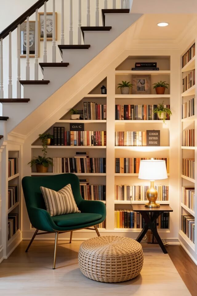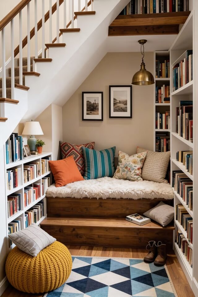 Under-stairs spaces are awkward by nature, which is exactly why they’re perfect for reading nooks. This design leans hard into the principle of embracing architectural constraints instead of fighting them. The sloped ceiling creates a natural sense of enclosure, making the nook feel cozy instead of cramped.