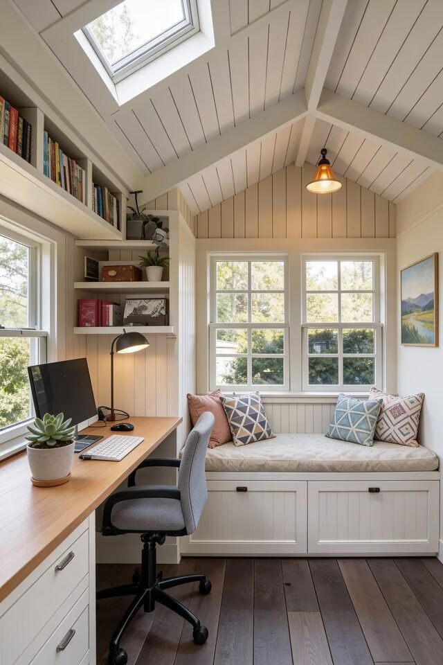 This reading nook proves that small spaces can multitask without looking stressed. The key principle here is clear zoning within a single footprint. Desk on one side, reading bench on the other, and suddenly the room knows who it is. The pitched ceiling adds vertical drama, while the skylight floods the space with daylight, reducing the need for heavy artificial lighting.