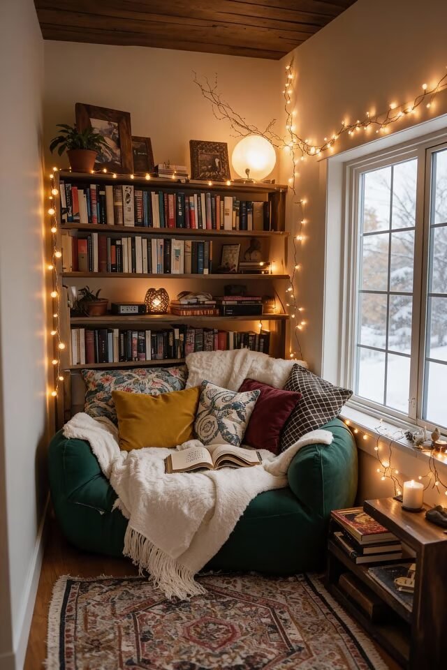 If cozy had a personality, it would be this nook. The design magic here comes from layered lighting, not the furniture. Fairy lights provide ambient glow, while a nearby lamp adds task lighting, making the space functional without killing the mood.