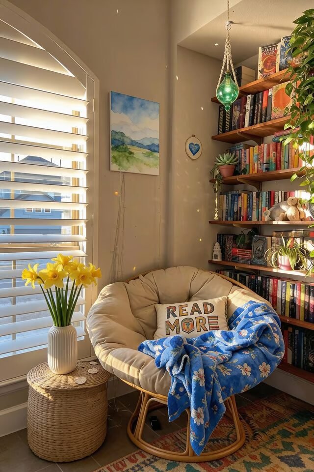 Stick to a neutral palette with subtle pattern contrast to keep things interesting but serene. This nook works because it respects negative space instead of filling it. It’s giving “quiet confidence” energy, which somehow makes reading feel more intentional and less like procrastination.