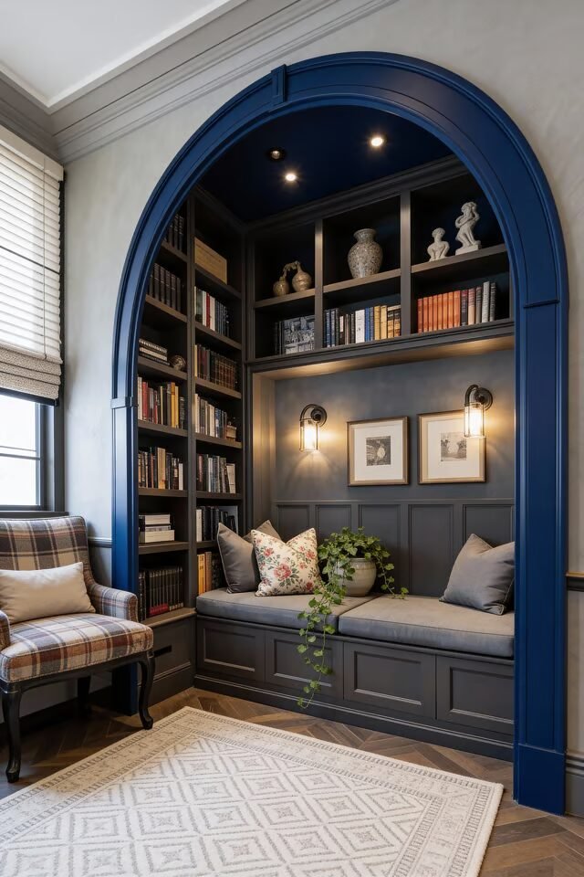 The deep arch frames the nook like a secret hideout, while built-in shelving keeps the look cohesive and architectural. Symmetry in shelving and lighting creates balance, preventing the dark tones from feeling heavy. When recreating this, lighting placement is critical. Wall sconces provide soft, directional light that doesn’t overwhelm the space.