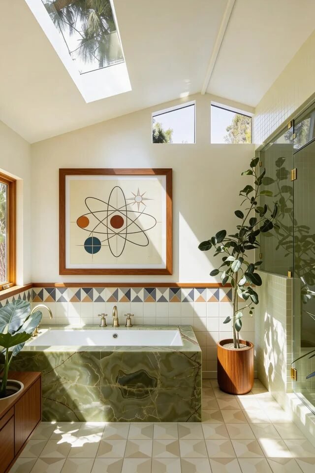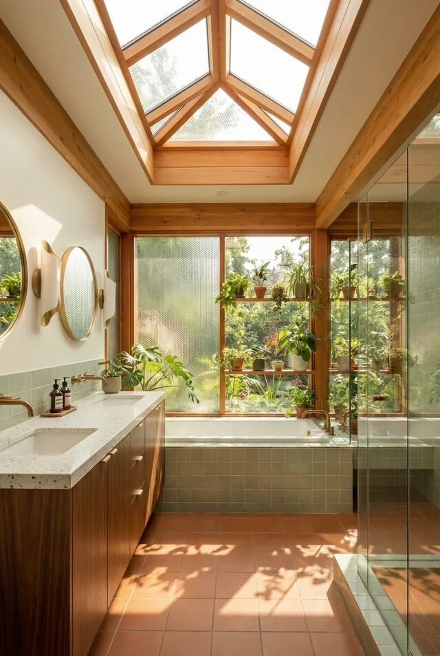 This bathroom is basically what happens when mid century modern meets greenhouse energy and says, “Let’s romanticize our morning routine.” The vaulted skylight framed in warm wood instantly establishes vertical drama, a classic MCM move that celebrates architecture instead of hiding it. Notice how the wood beams visually guide the eye upward, creating height and balance in a narrow layout. That’s not accidental — it’s spatial choreography.