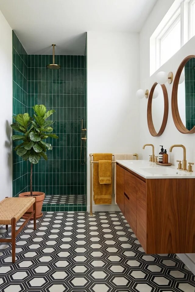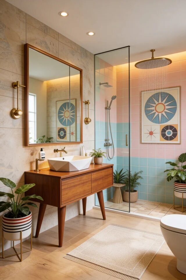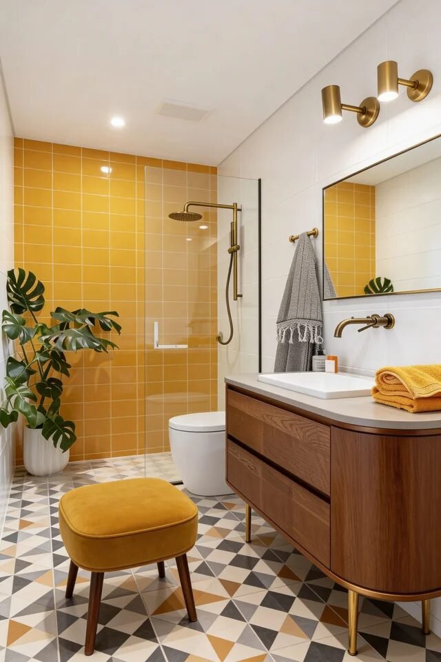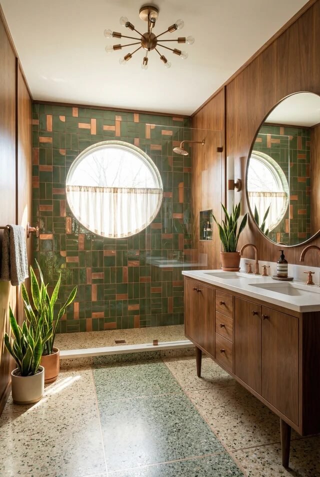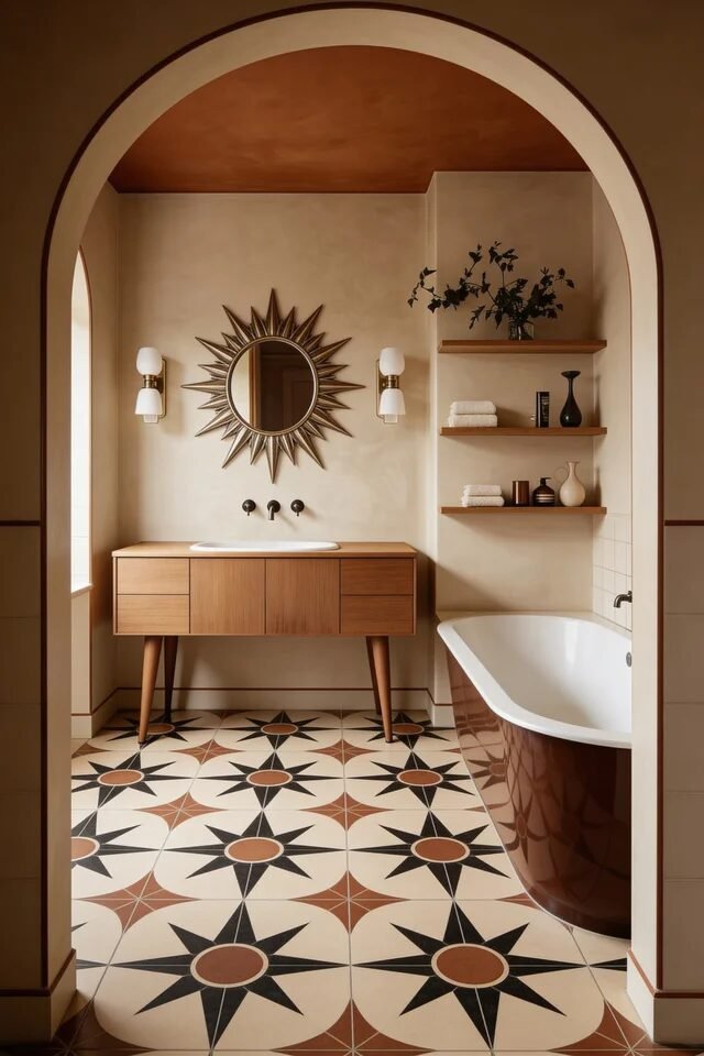 Now look down. The geometric floor pattern anchors all that warmth with rhythm and repetition. Mid century design loves geometry, but scale matters. Medium-scale patterns prevent visual chaos in tighter footprints. Pairing it with a walnut vanity keeps the palette grounded and cohesive.