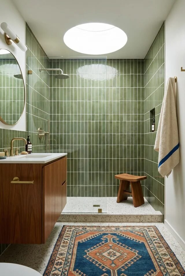 The circular skylight above? That’s a statement moment. Organic shapes soften all those straight grout lines and echo the round mirror and curved hardware. If we’re copying this look, keep grout lines thin and consistent — chunky grout would ruin the sleekness. Add one warm textile like a patterned rug for balance. When color is bold, restraint everywhere else is the flex.