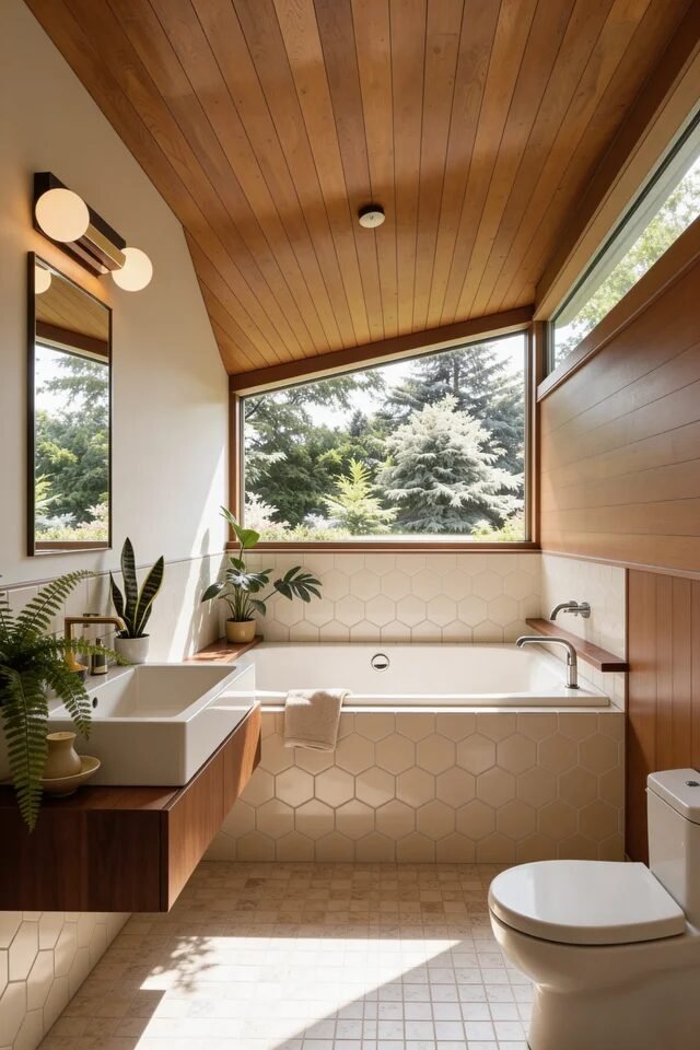 This bathroom leans into warmth, and we are not mad about it. The cedar plank ceiling draws the eye diagonally, creating movement and architectural interest without extra decor. Wood on the ceiling is a mid century power move because it visually wraps the space and adds intimacy. It’s cozy but still structured.