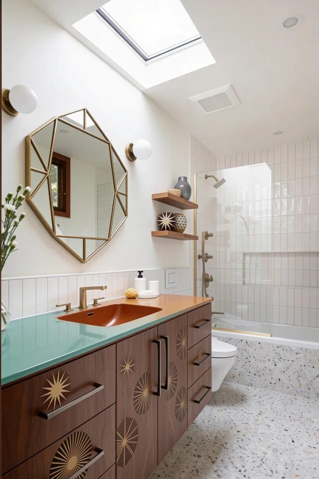 The aqua countertop introduces a retro pop without overwhelming the room. Pairing it with warm brass hardware keeps the palette cohesive and elevated. Notice how the geometric mirror echoes the starburst theme subtly. That’s design continuity, not coincidence.