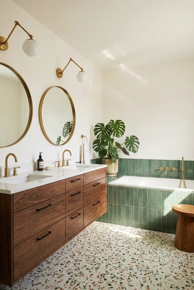 The terrazzo shower base adds texture without competing. In mid century interiors, texture replaces clutter. Instead of adding decor, we layer materials: glossy tile, matte terrazzo, warm walnut vanity, brushed brass fixtures. That contrast creates depth without chaos.