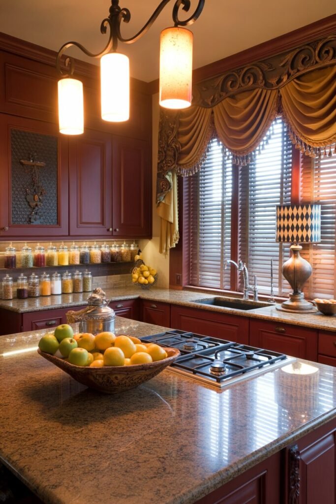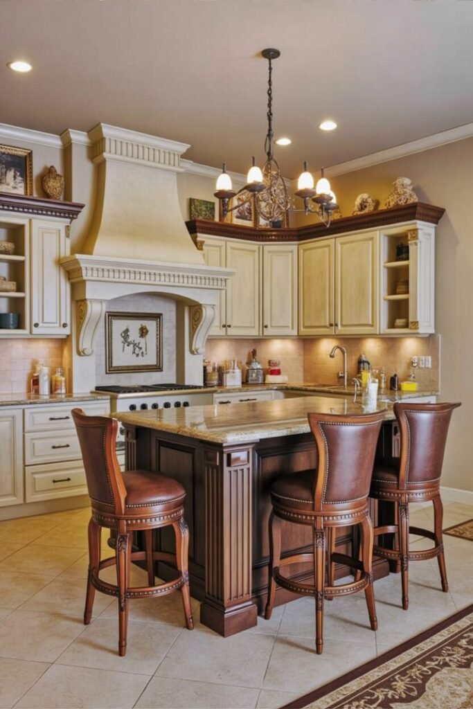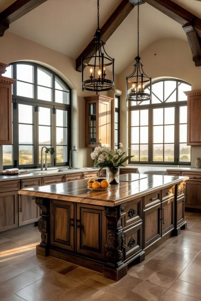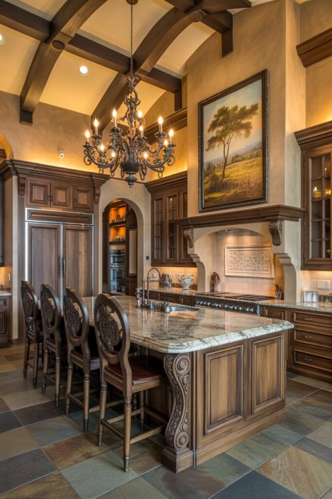 To recreate it, start with rich wood cabinetry (walnut or mahogany) and pair it with marble or travertine countertops. The mix of smooth and carved surfaces adds visual rhythm — like design jazz, but make it elegant. Lighting is key: chandeliers or ornate iron fixtures give a formal glow, while under-cabinet lighting keeps the workspace functional.
