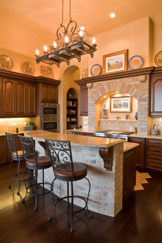 If your goal is to make your kitchen feel like a cozy Tuscan villa where the smell of garlic and olive oil lingers in the air, this is the vibe. The key here is mixing texture and tone — rich wooden cabinetry against rough-cut stone walls creates that earthy, layered look that feels timeless. It’s basically texture therapy for your kitchen.