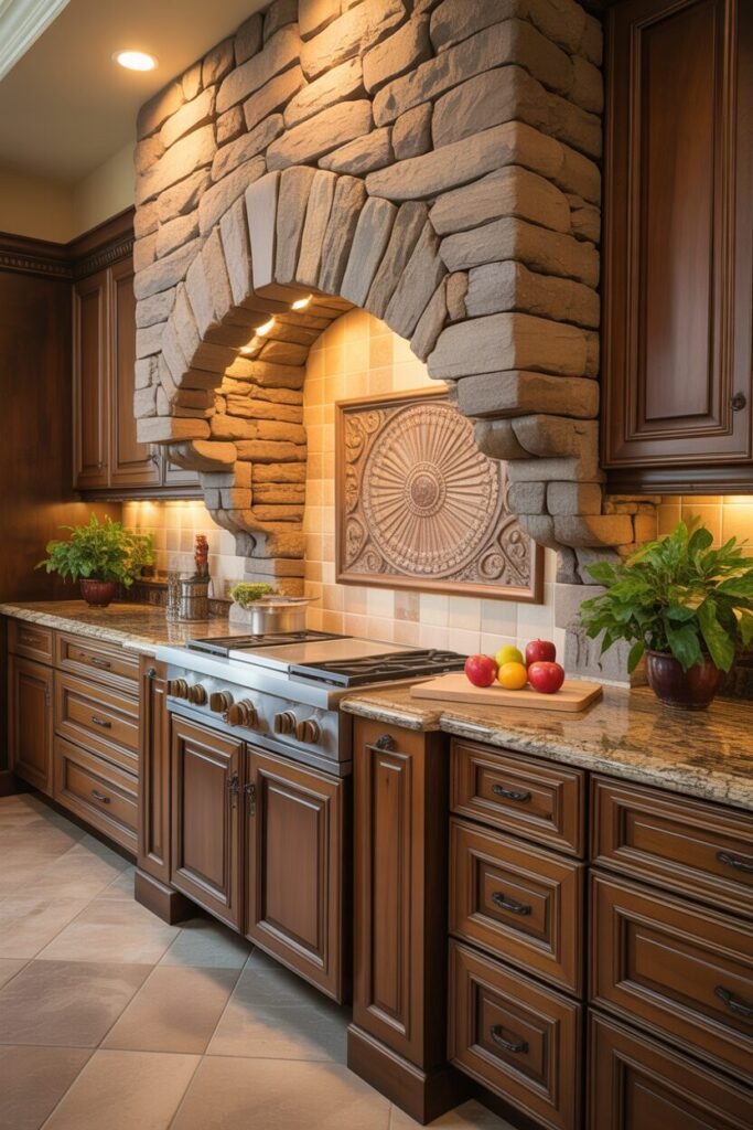 Choose chunky natural stone with texture — limestone, sandstone, or even faux stone veneer if you’re on a budget. Pair it with softly detailed cabinetry in warm wood tones to complement without competing. Lighting is crucial here; add small recessed lights under the arch to highlight the stonework’s dimension.