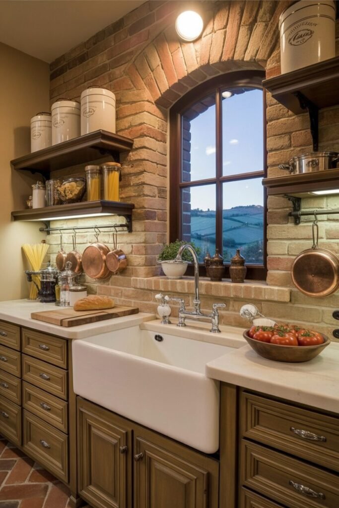 This one feels straight out of an Italian movie scene — all that’s missing is the background accordion music. The star here is the exposed brick wall, which instantly sets a rustic tone. Paired with that deep farmhouse sink, it creates the perfect Tuscan mix of warmth and practicality.