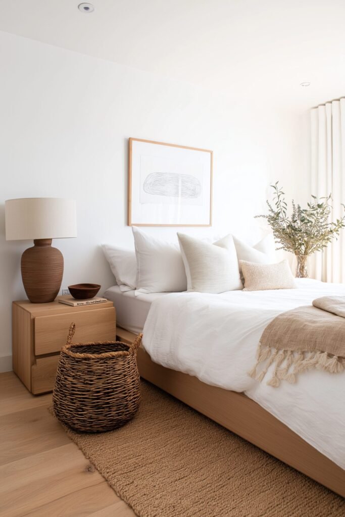 If you’ve ever walked into a minimalist bedroom and thought it felt cold, it likely lacked natural materials. Wood is a game-changer. A sleek oak bed frame or a warm walnut nightstand instantly balances those crisp minimalist lines.
