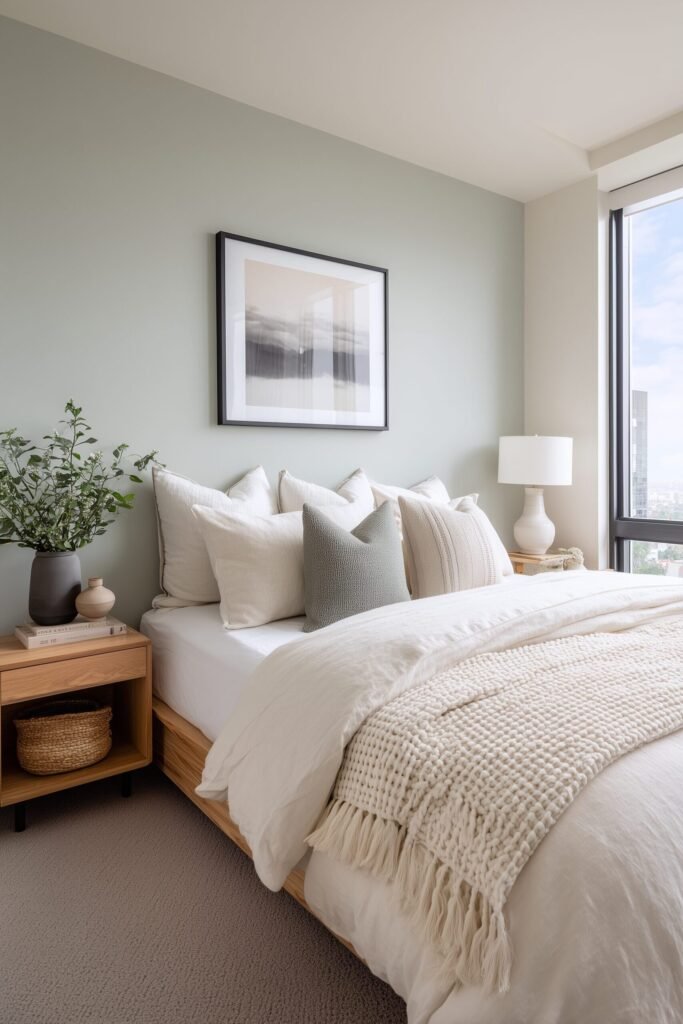 An accent wall in a minimalist bedroom isn’t about using wild colors or busy patterns—it’s about adding a layer of subtle depth. We’ve seen incredible results with soft sage, muted clay, or a smoky gray. These tones can instantly transform a flat white box into a layered, inviting space.