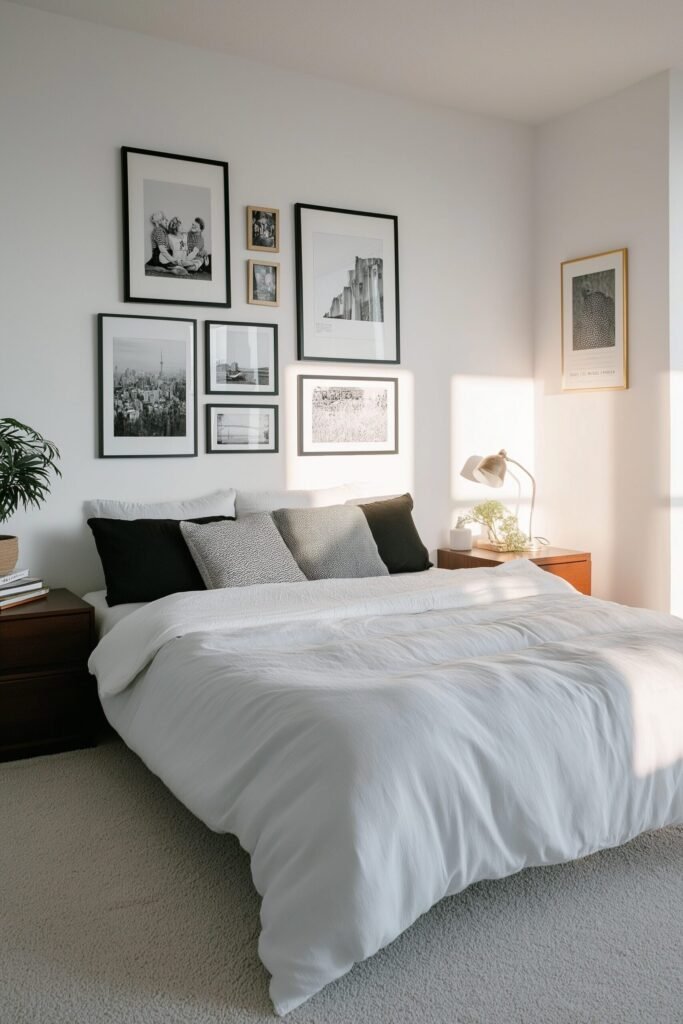Personal photos in a minimalist bedroom? Absolutely—but here’s the catch: uniform framing is everything. Matching black, white, or wooden frames keep your gallery wall sleek instead of chaotic.