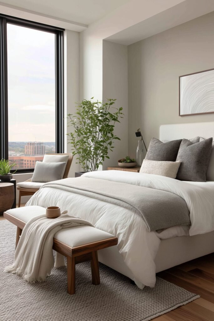 Consider an armless accent chair, a simple bench at the foot of the bed, or even a sleek ottoman. The design principle here is balance: we’re adding utility without crowding the room.