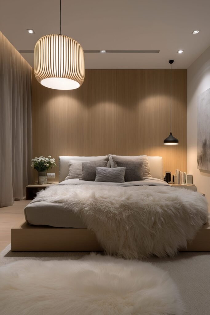 Think a sleek pendant light, a sculptural bedside lamp, or even modern recessed lighting with character. This is the principle of contrast at play: in a pared-down room, one thoughtful piece of lighting draws the eye without overpowering the space.