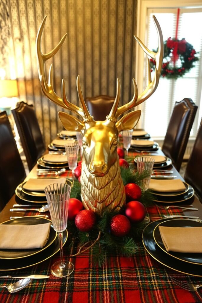Let’s talk about the golden reindeer centerpiece, because wow. This is the ultimate “holiday flex.” The principle in action: emphasis and hierarchy. That shiny stag head dominates the tablescape, while the plaid runner grounds the scene and ties in the red ornaments for cohesion.
