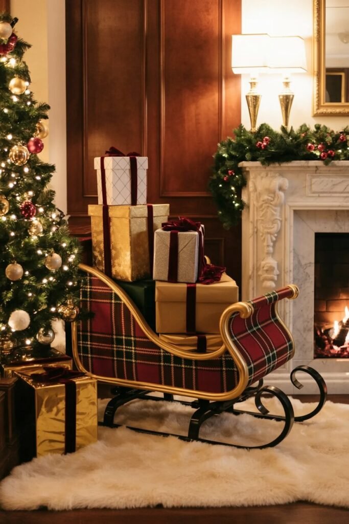 Layering textures also matters: shiny wrapping paper, soft faux fur rug, twinkling lights—all create depth. Basically, this is design theater: you walk in, and boom, holiday magic hits you like Mariah Carey’s high note. The sleigh doesn’t just hold gifts, it holds your entire Christmas personality. And honestly? We love the drama.
