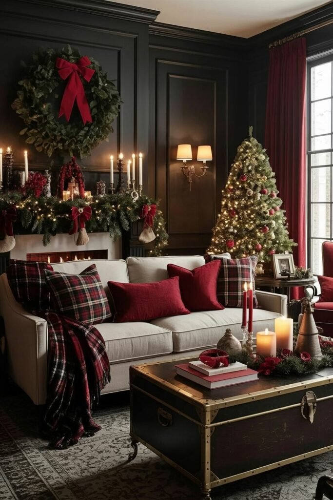 If you’ve got dark walls, congratulations—you already have the perfect backdrop for a dramatic Ralph Lauren Christmas. The magic here is contrast and layered lighting. Against a black-paneled wall, red and white accents practically glow, and greenery pops like it’s 3D.