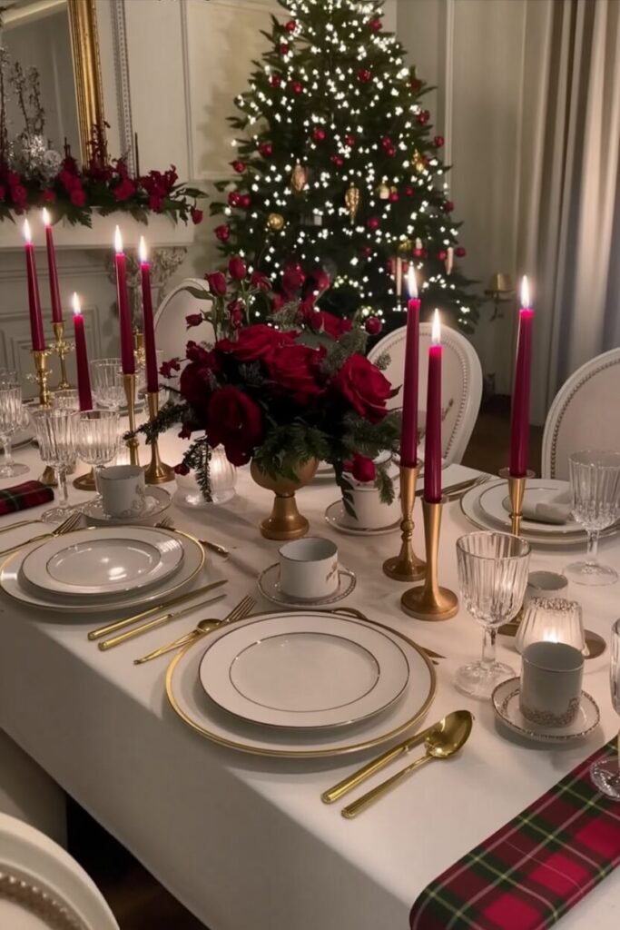 Gold cutlery and candleholders provide high-contrast luxury against the crisp white plates and tablecloth. The neutral base grounds the scene, while bold accents (red and gold) set the tone. Also, notice placement: the tree isn’t just anywhere—it frames the table like a photoshoot backdrop. That’s intentional design.