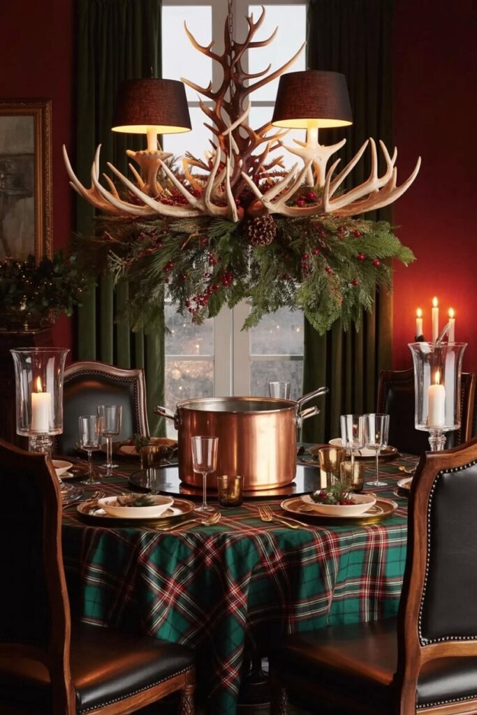 The plaid tablecloth is key because it anchors all the other elements into a cohesive theme (pattern repetition = instant harmony). Pro tip: when mixing bold statement pieces (like an antler chandelier), keep the rest of your color palette tight. Here, it’s deep greens, reds, and metallics, which scream holiday without chaos.
