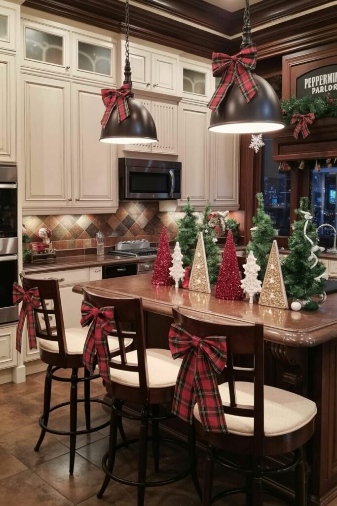 Kitchens are usually chaos zones during Christmas, but this look turns “cookie disaster central” into Ralph Lauren chic. The key here is repetition and vertical emphasis. Plaid bows on the chairs and pendant lights instantly unify the space and carry the holiday theme into a functional room.
