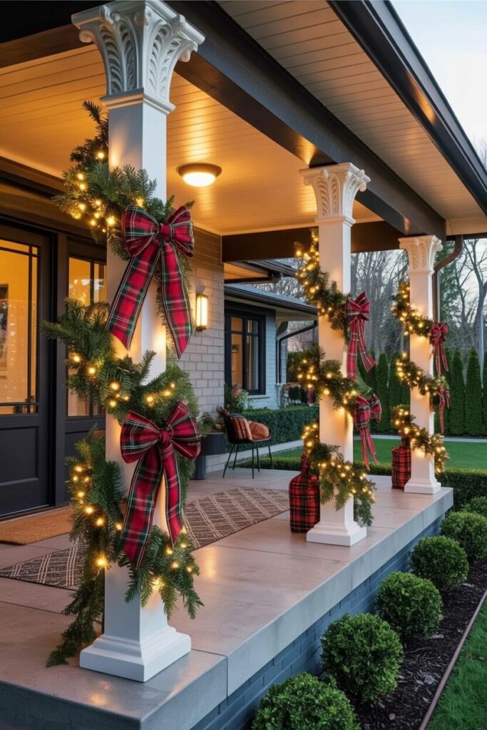 Your porch is basically your home’s holiday handshake—it sets the tone before anyone walks in. This look nails it with scale, repetition, and vertical design. Garland wrapped around each column with oversized plaid bows draws the eye up, making the entrance feel tall and grand.