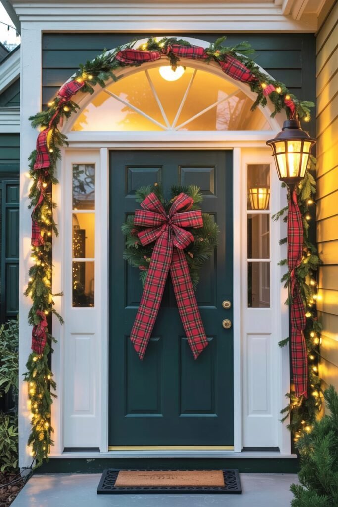 Your front door is basically the cover of your holiday storybook, so why not make it Ralph Lauren-level iconic? This look works because of scale and proportion. That massive plaid bow is oversized enough to be dramatic, but still balanced by the slim garland and twinkly lights.