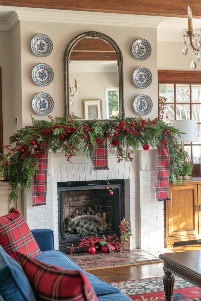 This fireplace says, “I don’t just decorate, I curate.” The principle at play here is rhythm and repetition. The plaid fabric is draped evenly, with greenery and berries repeating throughout the garland for a polished but cozy vibe. Notice how the mirror above creates vertical balance, while the side plates bring in symmetry—because design loves balance as much as we love peppermint hot cocoa.