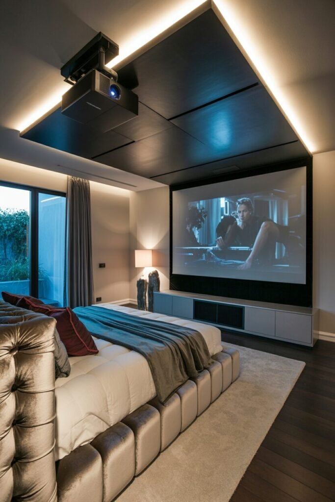 Why settle for Netflix on your phone when you can go full Hollywood premiere? A ceiling-mounted projector above the bed makes every movie night feel like a private screening. Design pros recommend blackout curtains—they instantly elevate both the picture quality and the vibe. Pair them with acoustic wall panels, which not only sharpen sound but also add a sleek modern look.