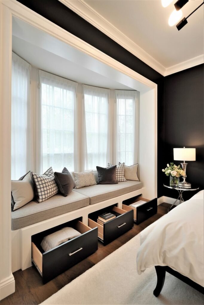 Why waste all that precious window space when you can turn it into a stylish seat and hidden storage? This design nails both comfort and practicality with a cushioned bench above pull-out drawers. Interior specialists often say multifunctional furniture is the secret weapon in small bedrooms, and this nook proves it.