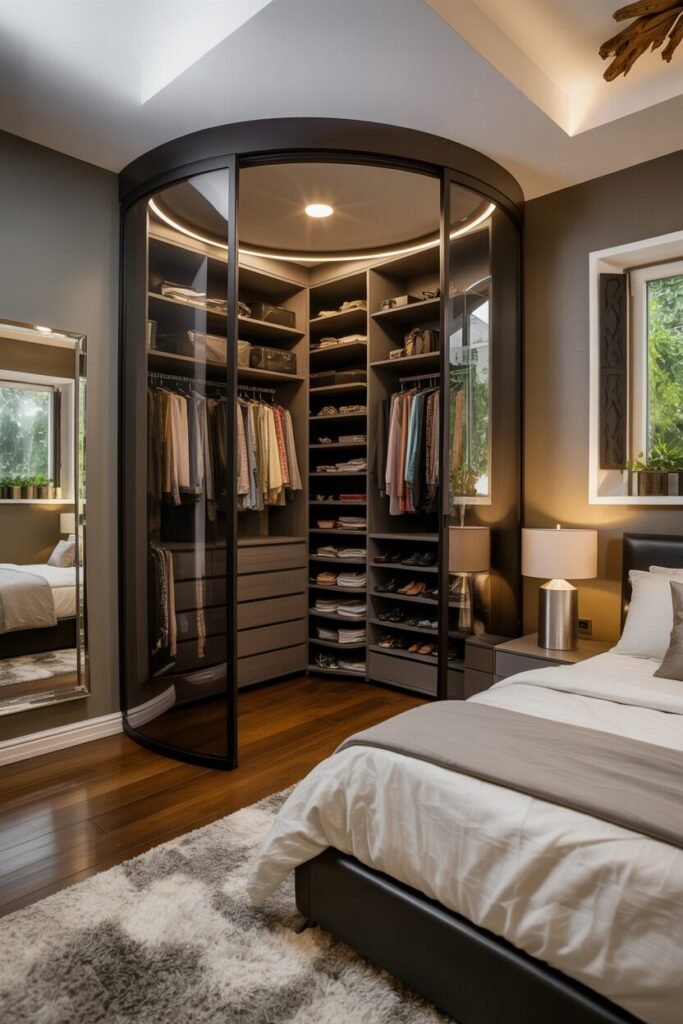 A walk-in closet like this isn’t just storage—it’s the runway of your daily life. Imagine sliding open those curved glass doors and everything is neatly lined up, almost begging you to pick it.
