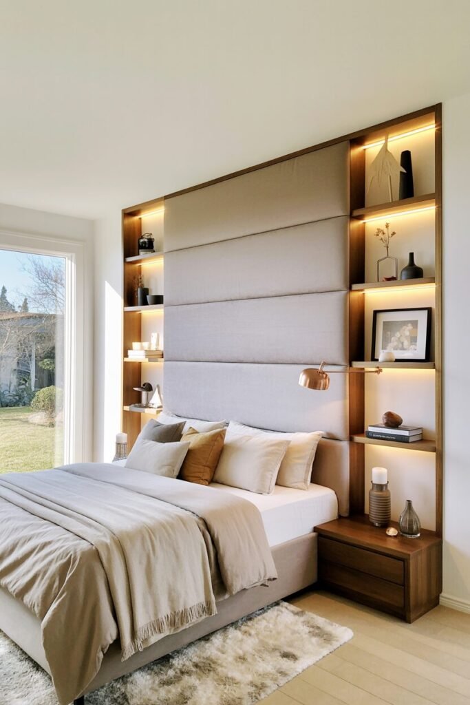 Plus, it saves space—no more cluttered nightstands. Tip: run hidden wiring for chargers or reading lights behind the panels. That way, you get function and finesse without cords messing up your carefully styled shelves. It’s headboard meets design genius, and it just works.