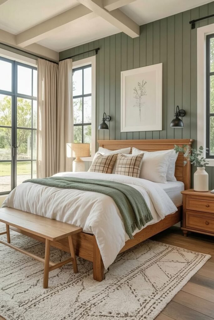 Green is the quiet overachiever of bedroom design—it calms the mind while subtly bringing the outdoors inside. Here, a muted sage accent wall is paired with plaid pillows and a cozy throw, instantly creating that rustic-meets-modern harmony.