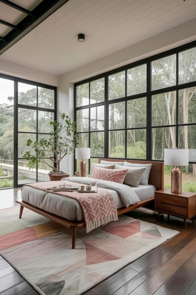 There’s something inherently luxurious about waking up to walls that aren’t really walls, but vast panes of glass framing the outside world. This bedroom design leans heavily on those floor-to-ceiling windows, creating a sense of openness that makes the bed feel like it’s floating in nature.