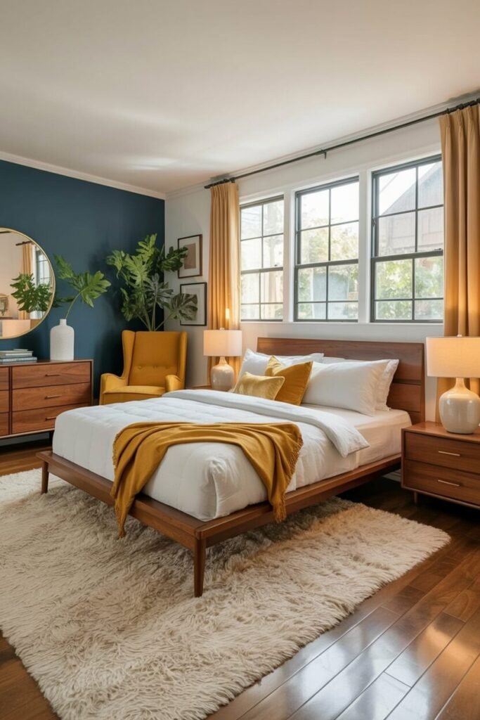 The mid-century modern furniture—with clean lines and warm wood tones—anchors the scheme beautifully, creating a space that feels curated rather than thrown together. The shag rug softens it all, making sure the room doesn’t lean too retro.