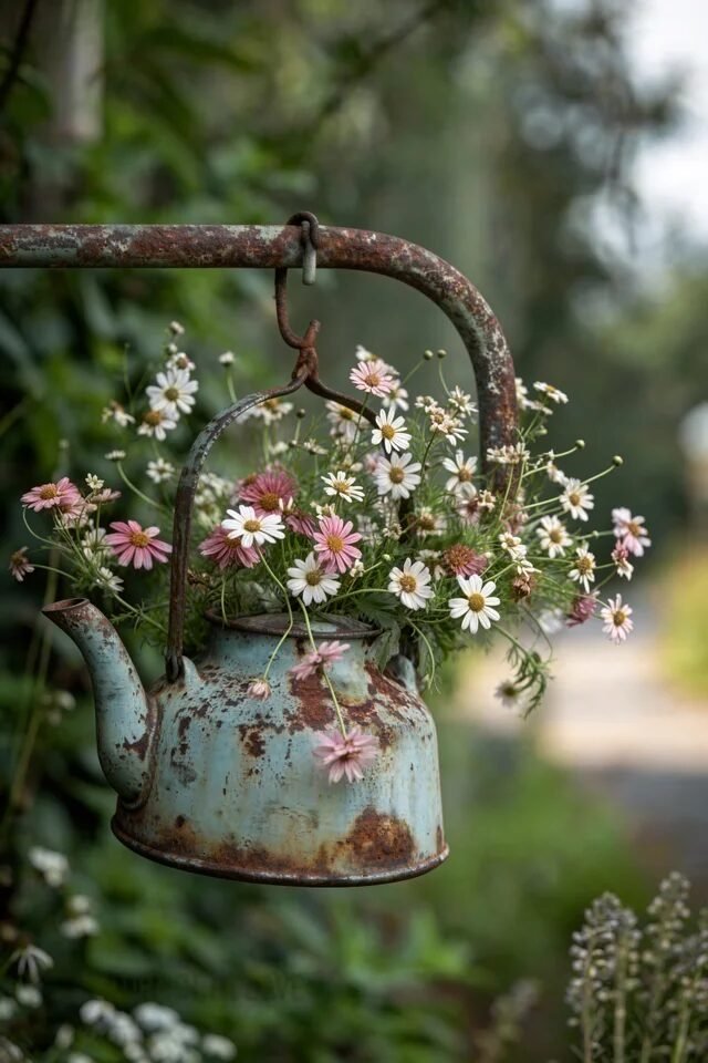 The key to making this look intentional (not random yard clutter) is plant composition. Mix three flower heights: trailing plants spilling over the edges, medium blooms filling the center, and a few taller stems for movement. Layered plant heights mimic natural garden growth and keep arrangements visually dynamic.