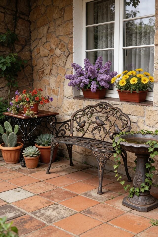 There’s something ridiculously charming about a simple stone patio paired with a vintage-style iron bench. It instantly creates that “European cottage courtyard” energy without requiring a castle budget. The magic here comes from layering materials: rough stone walls, warm terracotta tiles, delicate flowers, and dark metal furniture. Contrast between rugged textures and delicate florals is what makes vintage garden styling feel authentic rather than staged.