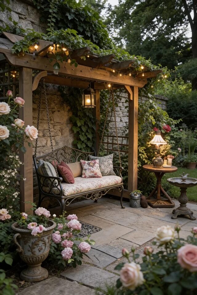 Climbing roses or ivy are the real stars of the show. When training vines over a pergola, guide them loosely along beams so the growth feels organic. Add warm string lights or a small lantern for evening glow. Soft lighting transforms vintage gardens from daytime pretty to evening magical.