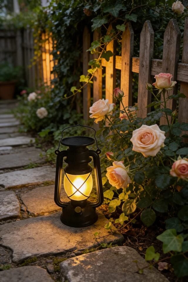 Instead of harsh modern lights, vintage-style lanterns create warmer ambiance. Place them near climbing roses, ivy-covered fences, or tucked slightly into planting beds. Soft, low lighting preserves the garden’s atmosphere while still providing visual rhythm along the walkway.
