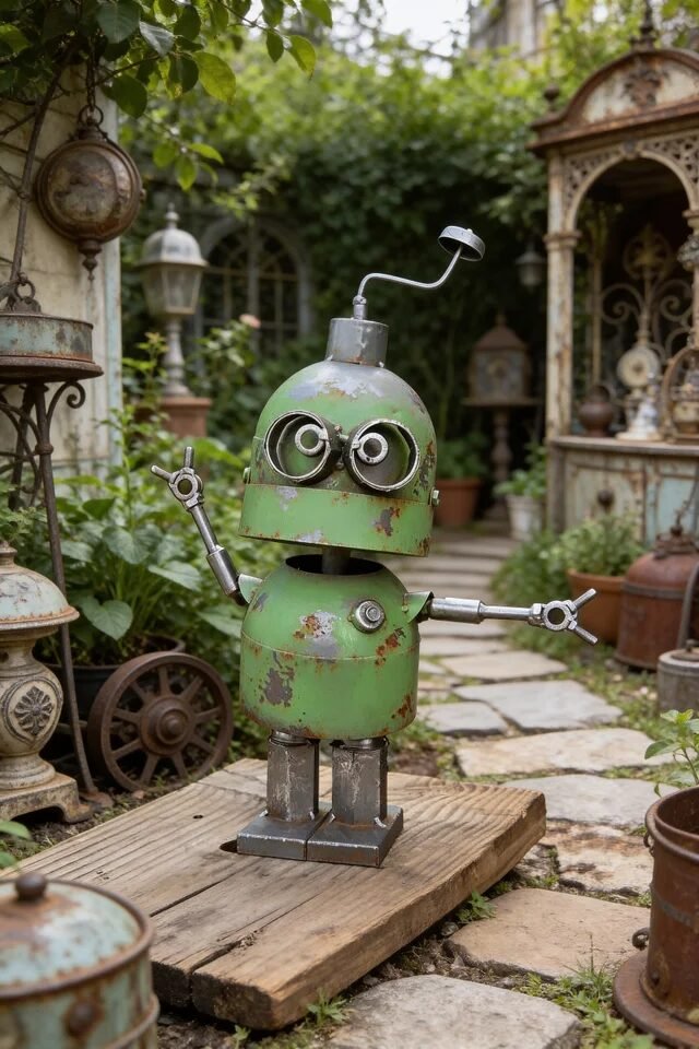 Every vintage garden deserves one unexpected piece that makes visitors do a tiny double take. Enter: the quirky metal robot sculpture. It’s playful, slightly rusty, and honestly the kind of decor that makes a garden feel personal rather than overly curated. Statement decor pieces like this work best when they contrast with the softness of surrounding plants.