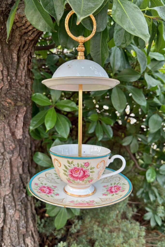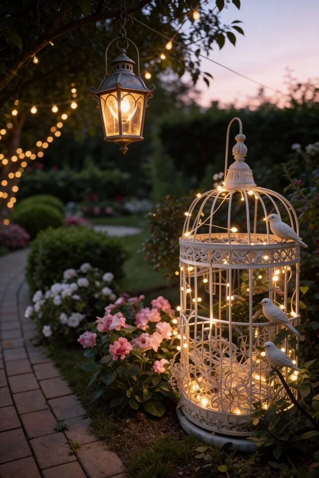 This setup is peak romantic garden energy. A vintage birdcage filled with tiny warm lights becomes a glowing sculpture nestled among flowers. It’s decorative, functional, and slightly whimsical—basically everything vintage garden decor should be. Decor pieces that double as lighting instantly elevate nighttime garden atmosphere.