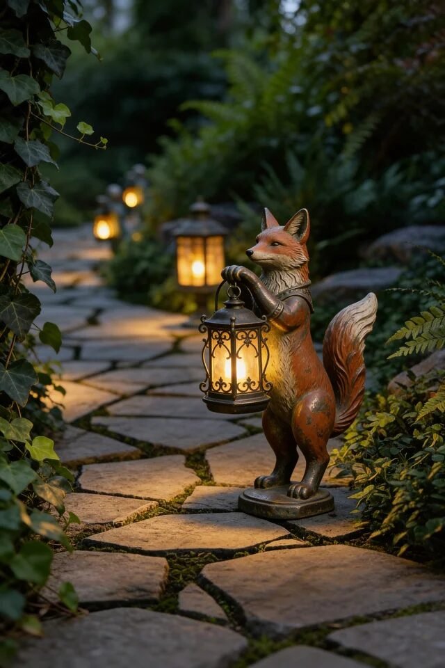 Okay, this might be the most charming garden detail ever. A fox statue holding a lantern feels straight out of a woodland fairytale, and honestly we’re not mad about it. Whimsical decor pieces like this add personality while still blending beautifully with a lush garden setting. Character statues work best when placed along pathways where they feel like tiny guardians of the garden.