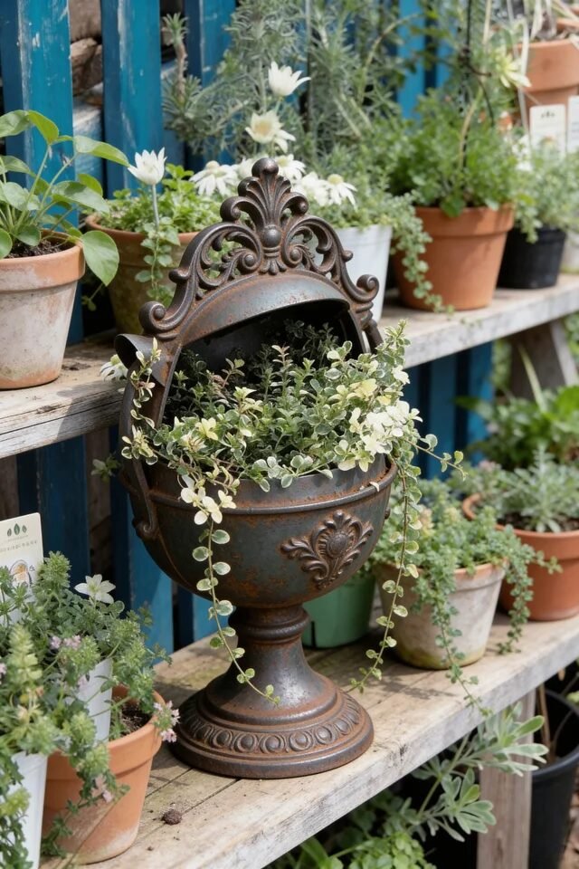 If vintage gardens had a signature accessory, the ornate urn planter would absolutely make the list. With its aged metal finish and decorative detailing, it brings a touch of old-world elegance even to the most casual backyard corner. Classic urn shapes naturally draw attention because their curves contrast with the organic shapes of plants.