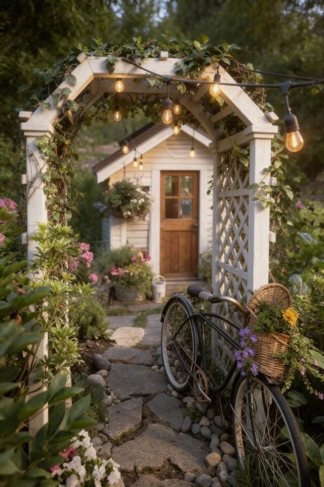 In this setup, the vintage bicycle leaning casually against the arch steals the show. It acts as a storytelling object rather than just decoration. A basket filled with flowers reinforces the cottage aesthetic and introduces color right at the entrance. Decor that hints at daily life—bikes, watering cans, baskets—adds narrative to vintage garden design.