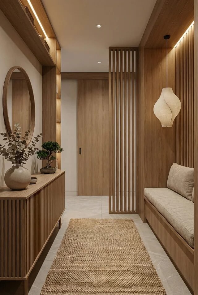 Okay, this is giving luxury spa entrance energy, and we’re not mad about it. The secret sauce here is layering—both in lighting and materials. You’ve got wood slats, smooth walls, stone flooring, and soft textiles all working together. Layering different textures within the same neutral palette creates depth without visual chaos.