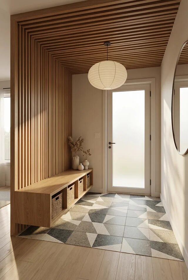This is that “we just casually designed a Pinterest-perfect entry” moment. The vertical wood slats wrapping from wall to ceiling instantly create a cocoon effect, which is peak Japandi. Vertical lines draw the eye upward, making even small entryways feel taller and more intentional. Pairing that with a floating bench keeps the visual weight low, so the space doesn’t feel cramped.