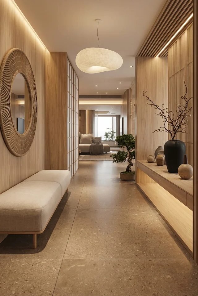 Long Japandi Hallway With Layered Lighting Glow